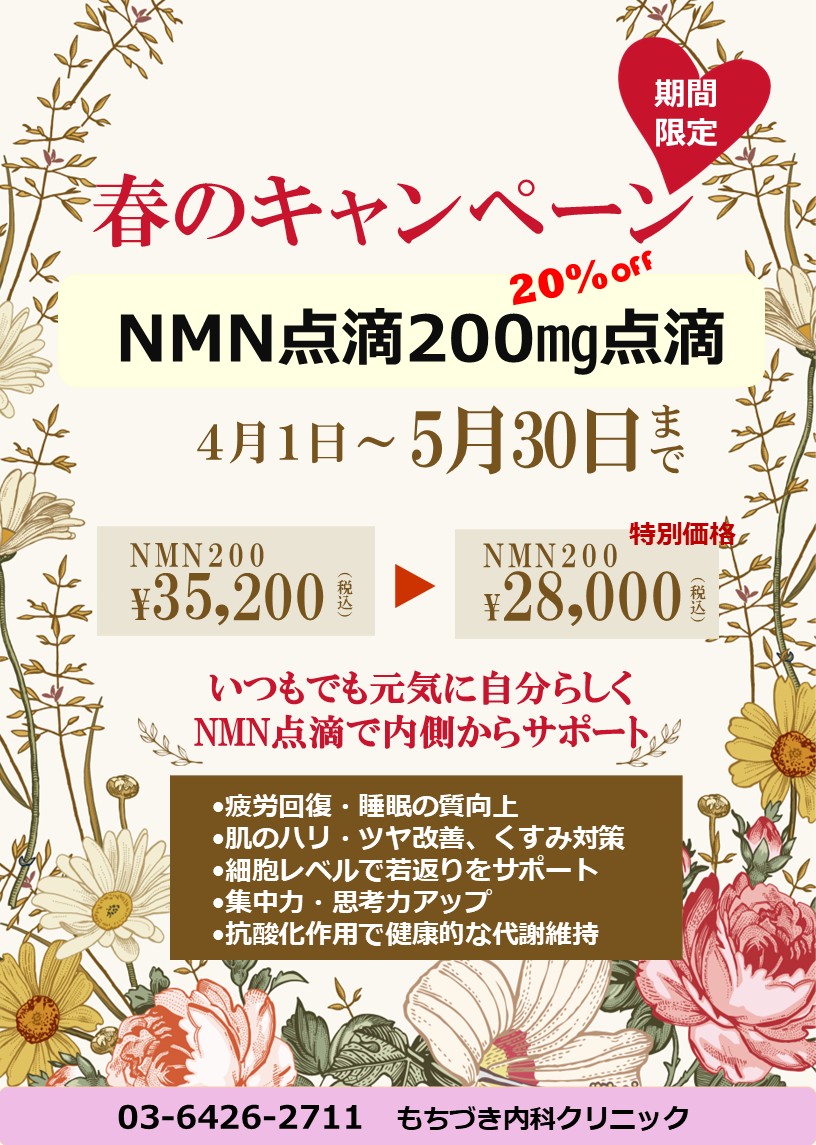 お知らせ NMN点滴200キャンペーンのお知らせ お知らせ 2026.04.10 春のキャンペーン ご好評をいただいております! NMN点滴200の特別キャンペーンを行っております。 4月1日~5月30日 NMN点滴通常価格 35,200円(税込)→20%off 28,000円(税込) 疲労回復・睡眠の質向上 肌のハリ・ツヤ改善、くすみ対策 細胞レベルで若返りをサポート 集中力・思考力アップ 抗酸化作用で健康的な代謝維持 ★いつでも元気に自分らしくNMN点滴で内側からサポート★ この機会に是非お試しください! ご予約はお電話または受付で承ります。 03-6426-2711